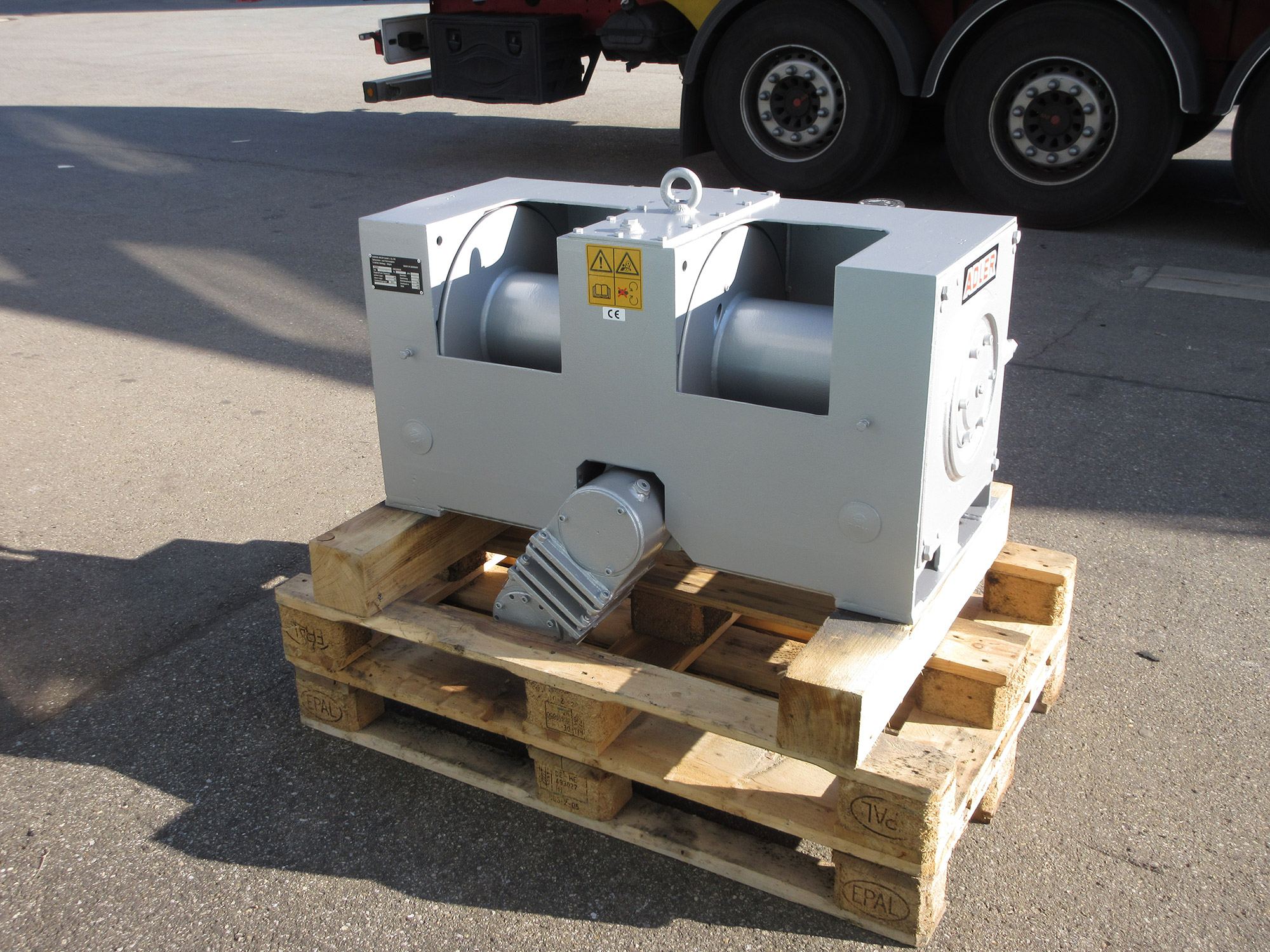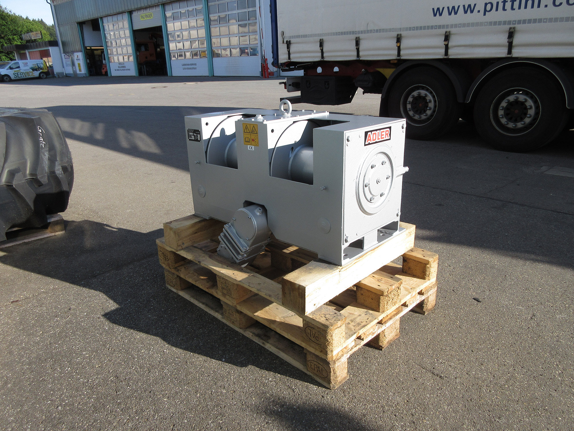 2 x 8t-Winde mit neuem Getriebe, Kupplungen und Bremsen einschl. Kettenvorsatzgetriebe, Getriebe 2L, 12 V Seileinzug oben, Steuerung vorne, 6 Monate Garantie.